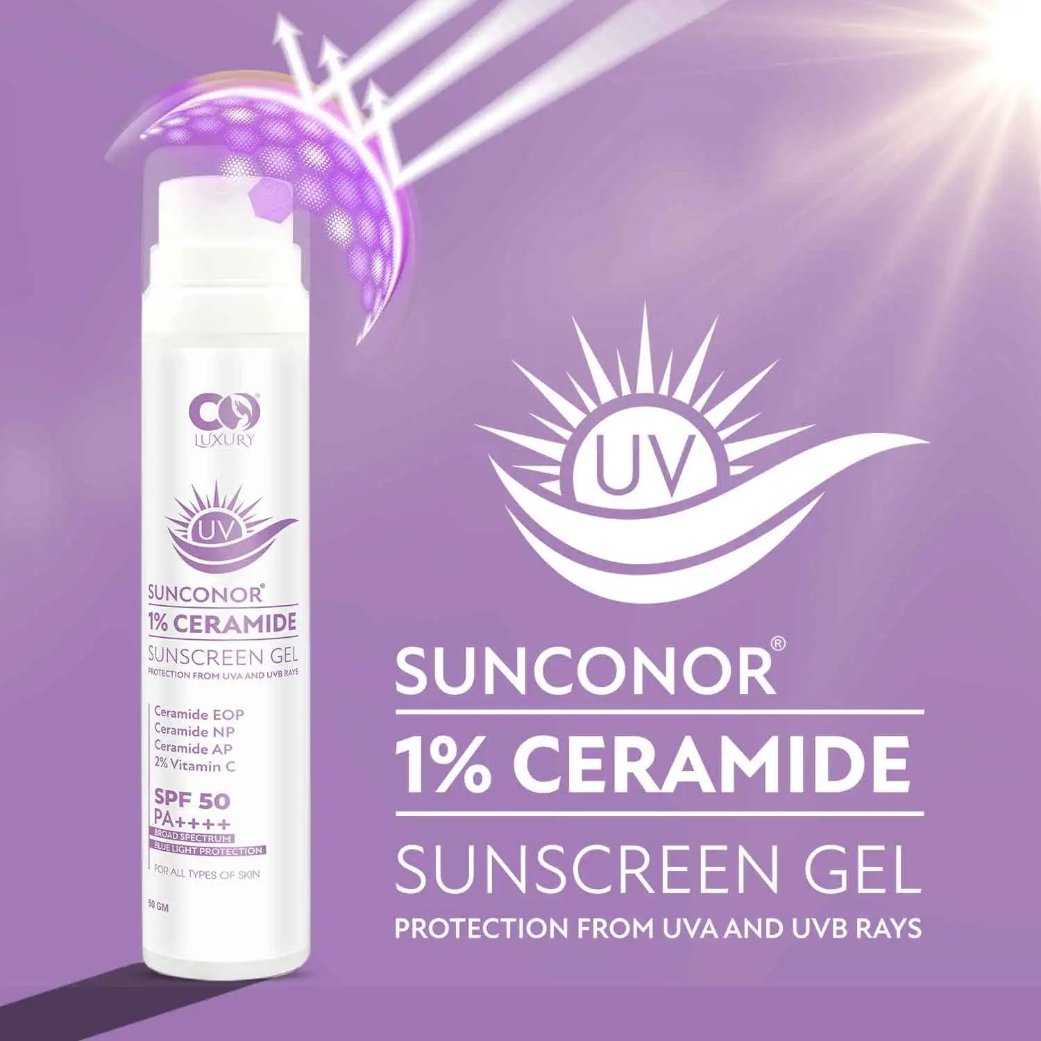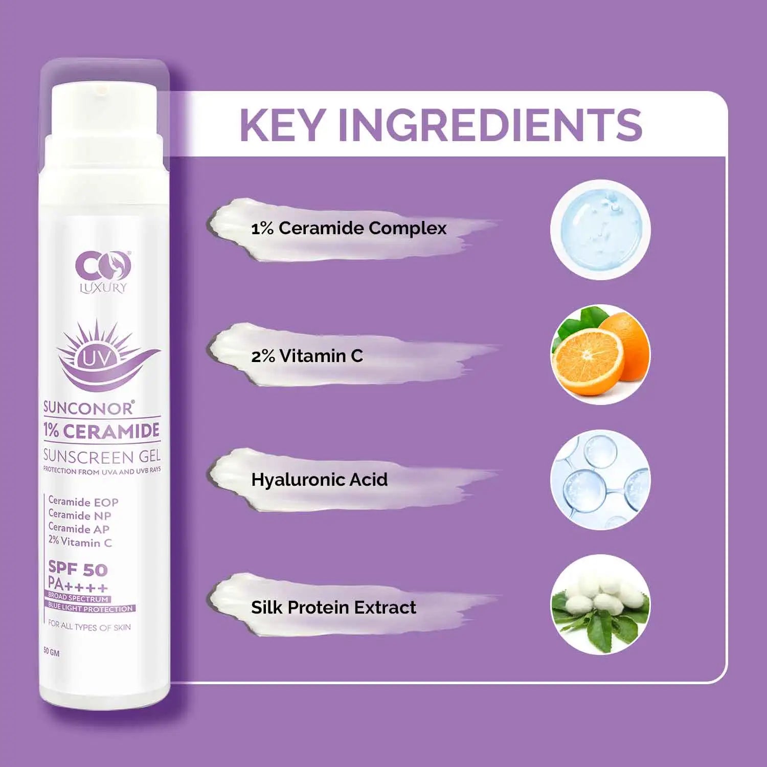 Introducing CO LUXURY 1% Ceramide Sunscreen Gel SPF 50 PA++++, a luxurious blend of skincare and sun protection. Infused with a potent Ceramide Complex (Ceramide EOP, Ceramide NP, Ceramide AP), Vitamin C, Hyaluronic Acid, Silk Protein Extract, and Zinc, this advanced formula offers unparalleled defence against harmful UV rays while nourishing and hydrating your skin.