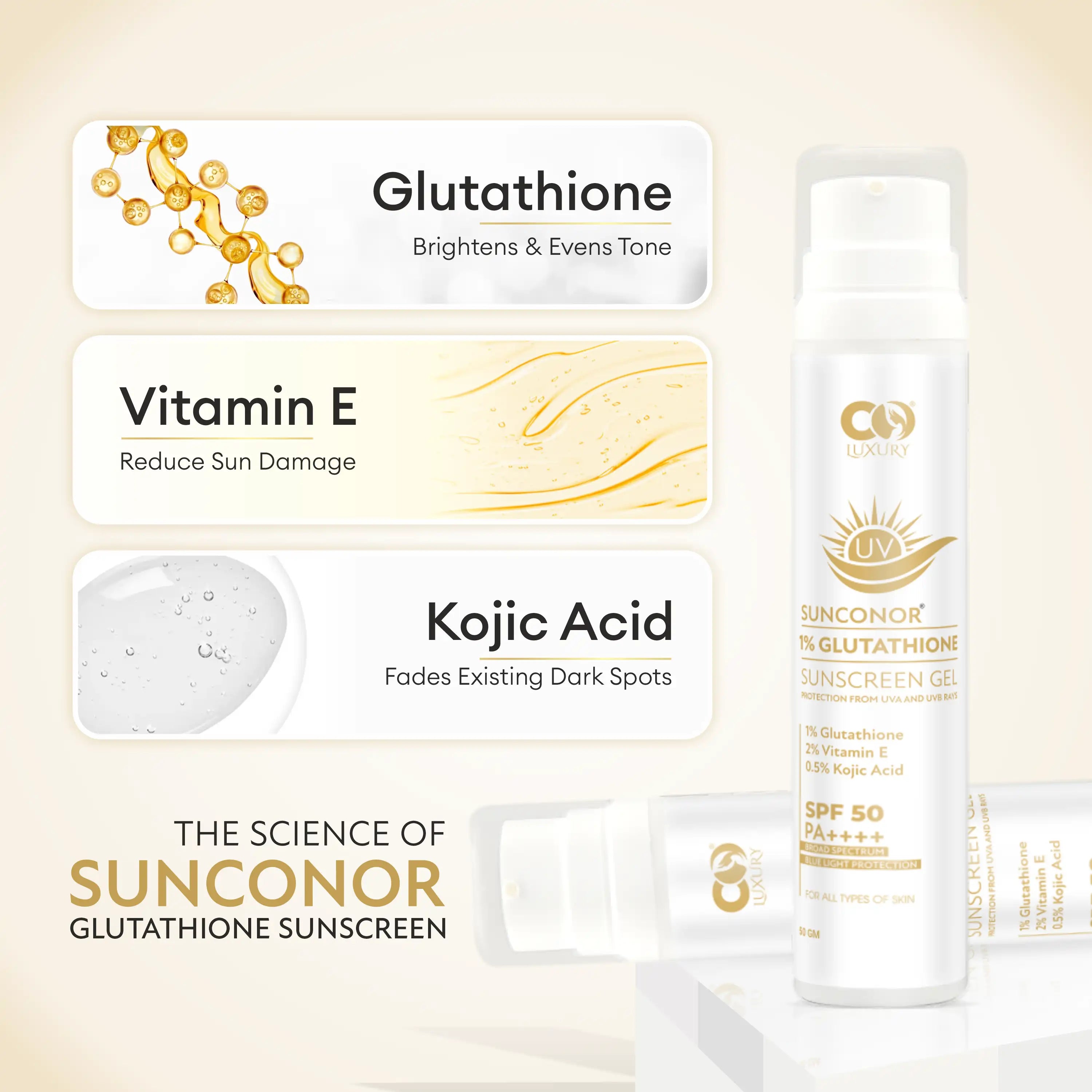 Introducing CO LUXURY Glutathione Sunscreen Gel, a luxurious blend of skin-loving ingredients designed to elevate your sun protection routine. Infused with 1% Glutathione, 0.5% Kojic Acid, and 2% Vitamin E, this advanced formula not only shields your skin with SPF 50 PA++++ broad-spectrum defence but also works to brighten and nourish your complexion.