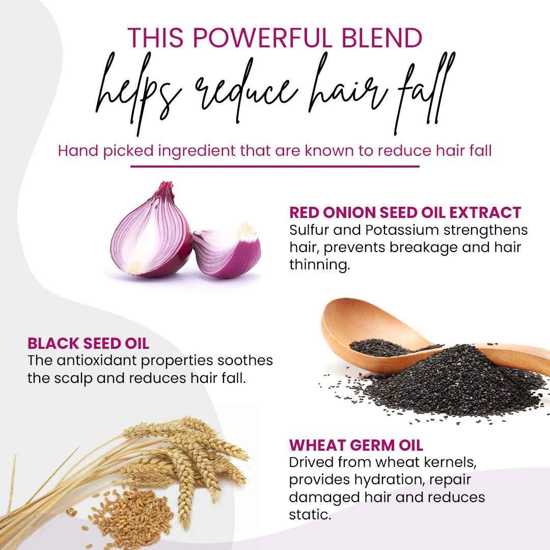 Onion seed oil-: Harness the potency of onion seed oil renowned for its ability to boost hair growth and minimize hair thinning. Rich in sulphur, it nourishes the scalp, enhancing blood circulation and promoting healthy hair follicles.