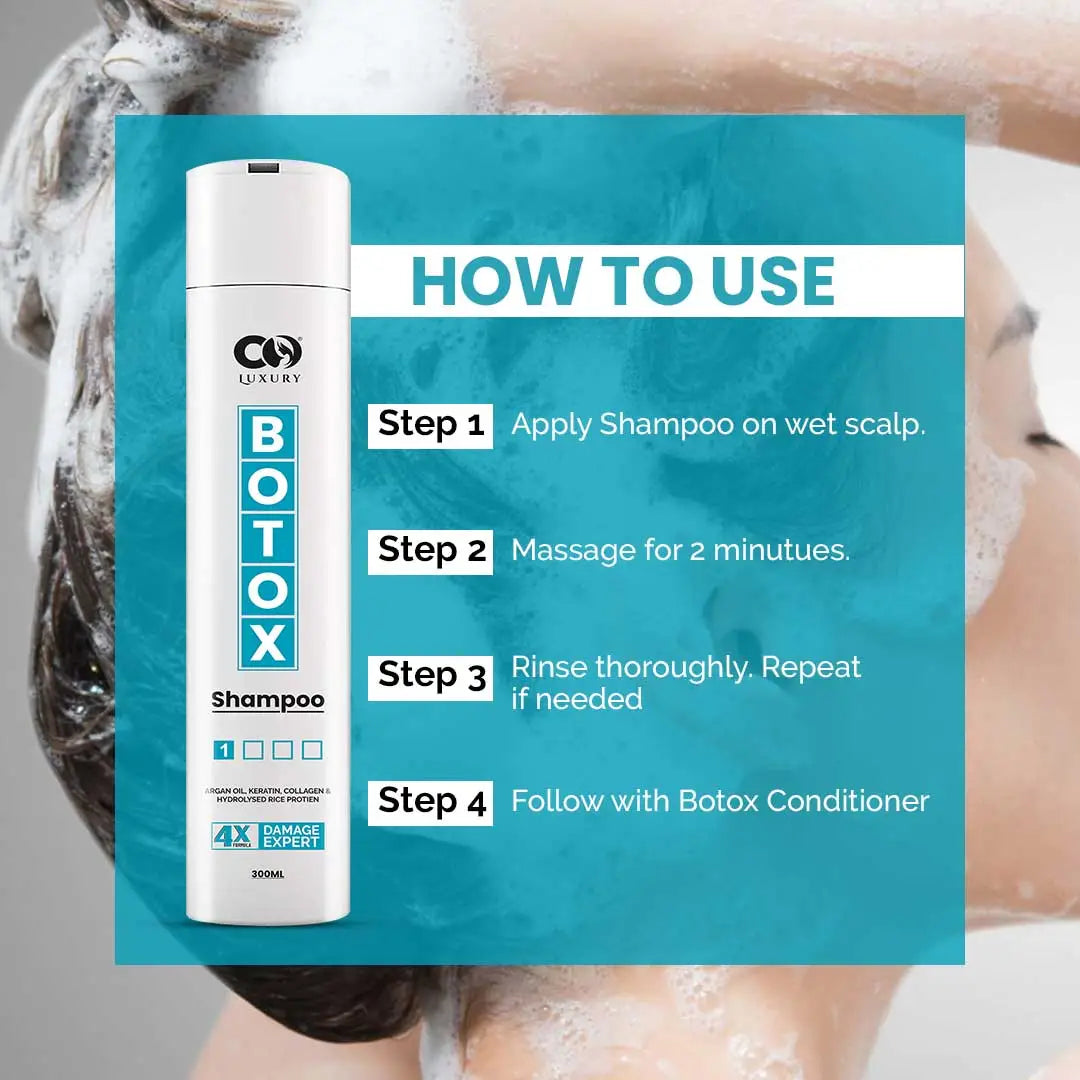 · Apply a generous amount of CO LUXURY Botox Shampoo to wet hair.