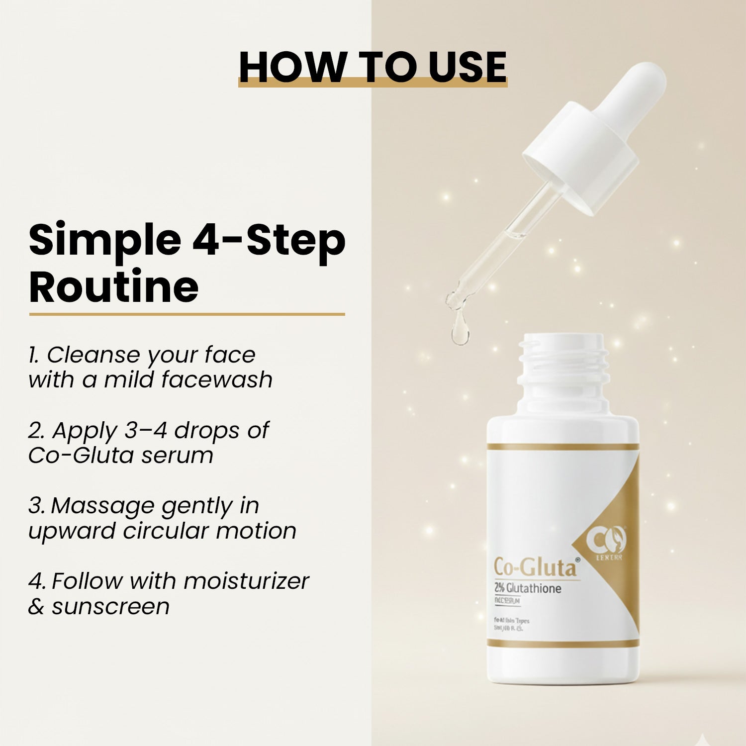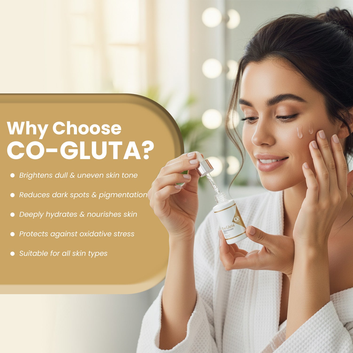 Co Luxury Co-Gluta Face Serum is formulated with 2% Glutathione, a powerful antioxidant that helps neutralize free radicals and improve skin clarity. Enriched with Vitamin C and Vitamin E, this serum reduces dullness, evens out skin tone, and helps fade pigmentation, acne marks, and tanning.