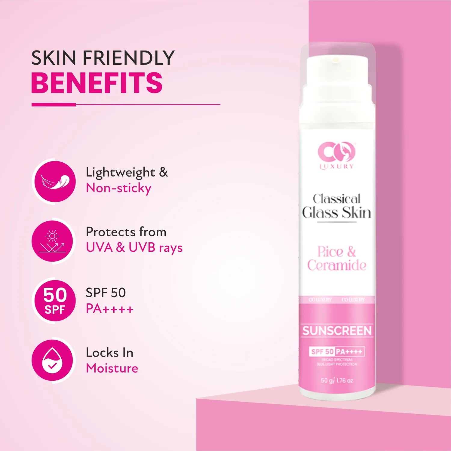 CO Luxury Rice & Ceramide Sunscreen SPF 50 PA++++ is a lightweight, fast-absorbing sunscreen designed to protect your skin from harmful UVA & UVB rays while delivering a natural glass glow finish. Specially formulated for Indian skin and climate, it blends effortlessly without leaving any white cast or greasy residue.