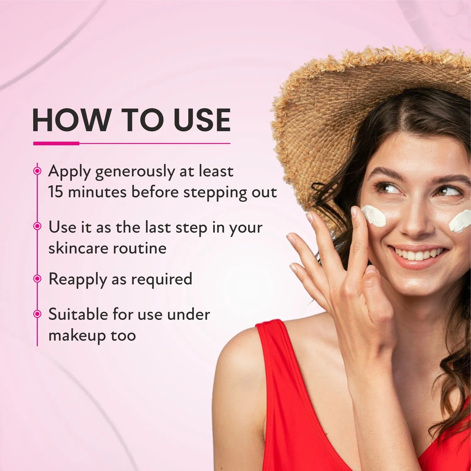 Apply a generous amount evenly on face and neck as the last step of your skincare routine. Use 15 minutes before sun exposure. Reapply every 2–3 hours for continuous protection.